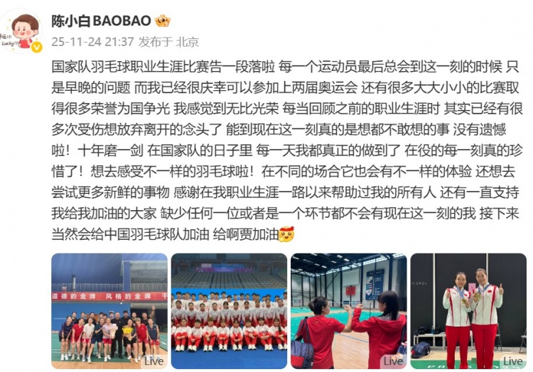直播吧11月24日讯 中国羽毛球运动员陈清晨发文表示从国家队退役。