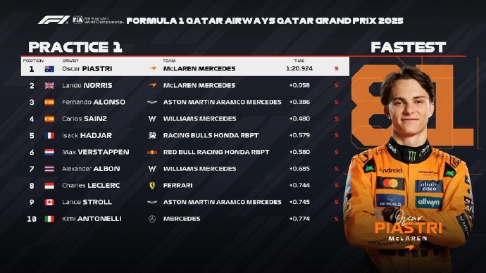 直播吧11月28日讯 F1卡塔尔大奖赛练习赛结束,皮亚斯特里单圈最快1:20.924,队友诺里斯第二。前五还有阿隆索、塞恩斯、哈贾尔。维斯塔潘第六,阿尔本第七,勒克莱尔第八。斯托尔和安东内利也跻身一练前十。