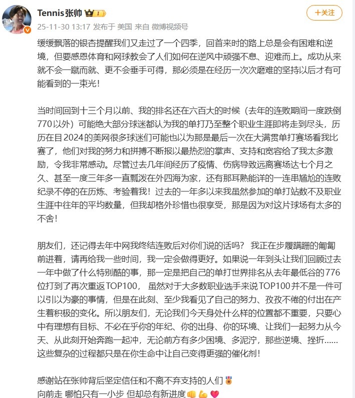 朋友们,还记得去年中网我终结连败后对你们说的话吗? 我正在步履蹒跚的匍匐前进着,请再给我一些时间,我一定会做得更好。如果说一年到头让我们回顾过去一年中做了什么特别酷的事,那一定是把自己的单打世界排名从去年最低谷的776位打到了再次重返TOP100, 虽然对于大多数职业选手来说TOP100并不是一件可以引以为豪的事情,但是在此刻、至少我看见了自己的努力、孜孜不倦的付出在产生着积极的变化。所以朋友们,无论我们今天身处什么样的位置都不重要,只要心中有理想有目标、不必在乎你的年纪、你的出身、你的环境、让我们一起努力从今天、从此刻开始奔跑一起冲,无论前方有多少困境、多泥泞,那些逆境、挫折……这些复杂的过程都只是在你生命中让自己变得更强的催化剂!