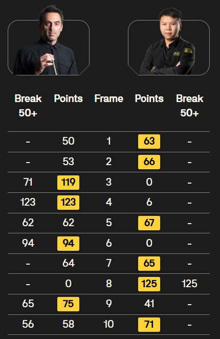 本场比赛周跃龙开局取得2比0领先,随后奥沙利文凭借单杆71分和123分将比分扳平。休息后周跃龙在多局比赛中实现逆转,并在第八局打出单杆125分拿到赛点。尽管奥沙利文挽救一个赛点,周跃龙最终在第十局稳住局面赢得胜利。