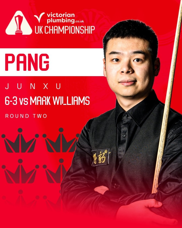 直播吧12月04日讯 2025斯诺克英锦赛16进8轮次,全场比赛马克·威廉姆斯打出单杆101、112分,庞俊旭打出单杆76、53、116分。开局庞俊旭一路扩大领先优势,一度4-1领先威廉姆斯,威廉姆斯第六局轰出112分破百连追两局,将比分追到3-4,随后庞俊旭打出单杆51、116分锁定胜局,以6-3的比分战胜威廉姆斯,成为首位晋级八强的中国球员!