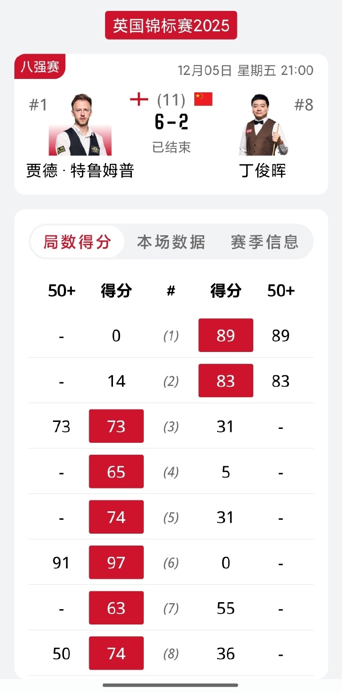 最终,贾德·特鲁姆普6-2战胜丁俊晖,率先晋级四强!
