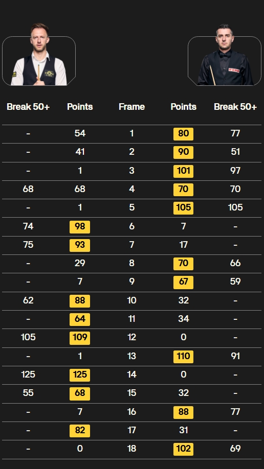 全场比赛马克·塞尔比打出一杆破百(105)和九杆50+(77、51、97、70、66、59、91、77、69),贾德·特鲁姆普打出两杆破百(105、125)和五杆50+(68、74、75、62、55)
