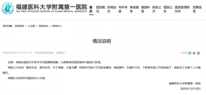 直播吧12月10日讯 12月10日,福建医科大学附属第一医院官网发布情况通报:近期,我院依规依纪对张水华违规兼职取酬、以虚假理由获取调休问题进行处理。
