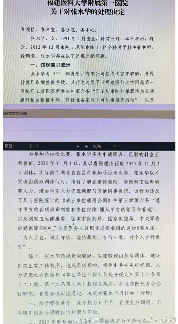 12月9日晚,网络流传一份福建医科大学附属第一医院的处理决定截图显示,“最快女护士”张水华存在违纪问题。包括与361°体育用品有限公司签约代言并取酬,未履行兼职取酬报批手续。还包括,2025年11月1日,张水华以虚假理由获取2025年11月2日调休,实际前往湖北省宜昌市参加马拉松比赛,张水华以不实理由获取调休行为违背了职业道德准则,导致科室临时调整人力,增加科室人力资源调配与其他同事负担。张水华被医院警告处分6个月,并不能参与2025年评优。