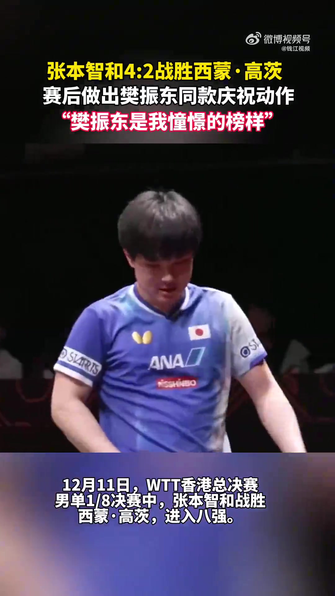 直播吧12月12日讯 WTT总决赛男单1/8决赛,张本智和4-2战胜西蒙·高茨,晋级8强。张本智和赛后庆祝致敬樊振东,采访时谈及此事。