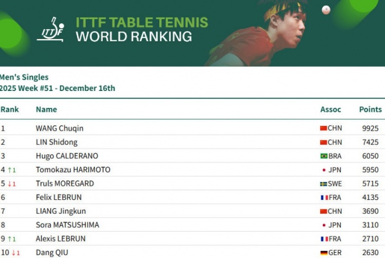 直播吧12月16日讯 世界乒联公布2025年第51周排名,男单方面王楚钦9925分排名第一,林诗栋7425分排名第二,雨果6050分排名第三。女单方面孙颖莎11600分连续第179周霸榜第一,王曼昱8248分排名第二,蒯曼5605分排名第三。