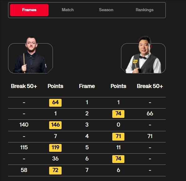 马克·艾伦打出2杆破100和1杆破50,张安达打出2杆破50。