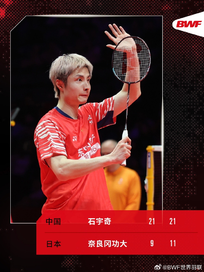 石宇奇2比0战胜奈良冈功大,比分21-9、21-11。以三战全胜、小组第一的战绩晋级半决赛。