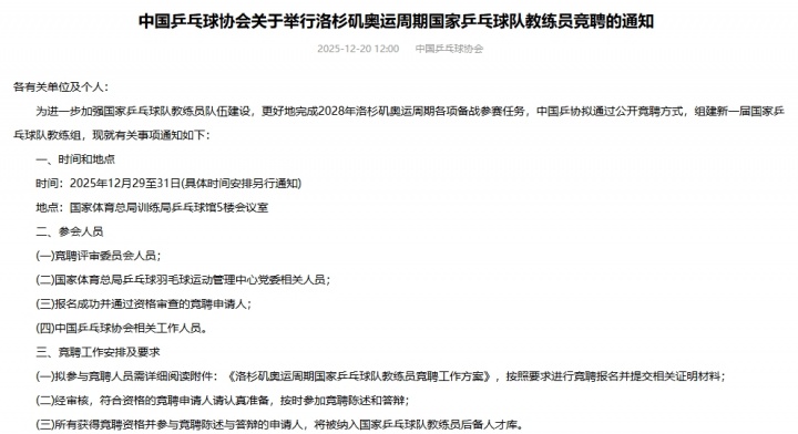 为进一步加强国家乒乓球队教练员队伍建设,更好地完成2028年洛杉矶奥运周期各项备战参赛任务,中国乒协拟通过公开竞聘方式,组建新一届国家乒乓球队教练组,现就有关事项通知如下: