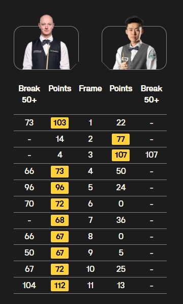 直播吧12月22日讯 2025斯诺克苏格兰公开赛决赛,全场比赛克里斯·韦克林打出一杆破百(104)和七杆50+(73、66、96、70、66、50、67),常冰玉打出一杆破百(107)。