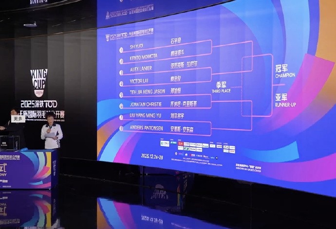 2025年天王杯国际羽毛球公开赛将于12月26日-28日在深圳进行,共有8位球员参赛,上半区首轮对阵为石宇奇vs桃田贤斗、拉尼尔vs赖浩俊,下半区首轮对阵为乔纳坦vs郑加恒、安东森vs刘洋名宇。