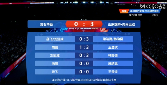 直播吧12月28日讯 乒超总决赛男团决赛,黄石华新vs山东魏桥。山东魏桥总比分3-0战胜黄石华新,夺得2025乒超联赛男团冠军,黄石华新获得亚军。