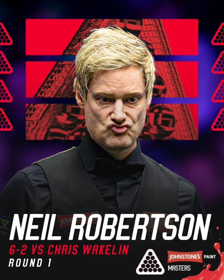 直播吧01月15日讯 斯诺克大师赛首轮最后一场,尼尔·罗伯逊击败韦克林,比分是6-2!