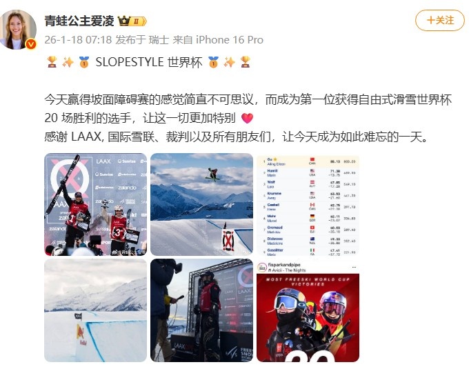 今日,谷爱凌社媒发文谈世界杯夺个人第20冠,原文如下: