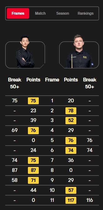 全场比赛凯伦·威尔逊打出一杆破百(111)和两杆50+(76、74),吴宜泽打出五杆50+(75、69、74、87、58)