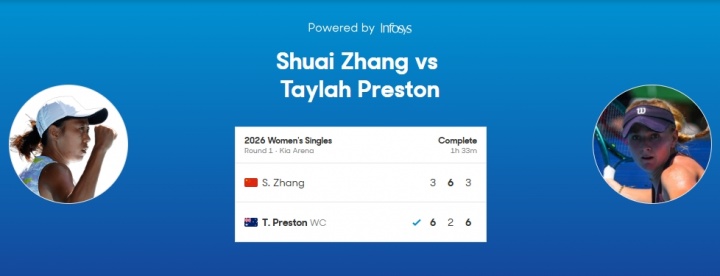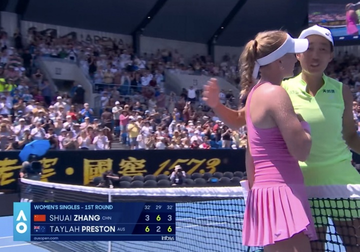 直播吧01月20日讯 2026年澳网女单首轮,张帅1-2不敌本土外卡选手普雷斯顿,遗憾未能晋级。