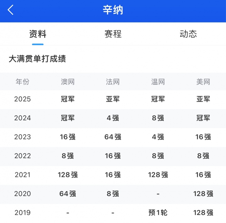 辛纳大满贯战绩↓
