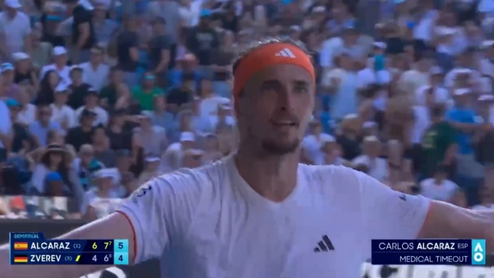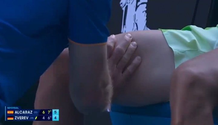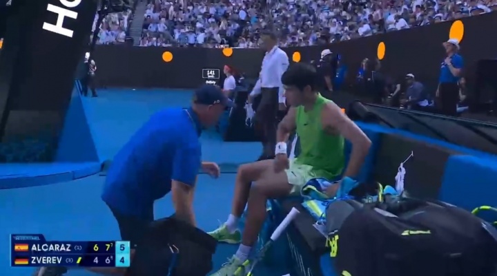 直播吧01月30日讯 澳网男单半决赛阿尔卡拉斯vs兹维列夫进行到第三盘,阿尔卡拉斯申请医疗暂停,兹维列夫认为阿卡是抽筋,所以按照规定不能申请伤停治疗,一直在旁边和赛事监督抱怨这一情况。