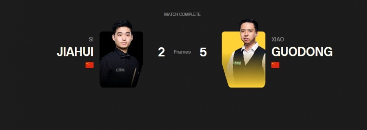 一号桌"中国德比"中,斯佳辉首局打出单杆78分,随后肖国栋接连打出72、97、122分连胜四局拿到赛点,第五局斯佳辉在肖国栋打出67分的情况下完成逆转挽救赛点,第七局肖国栋单杆78分超分,最终肖国栋5-2战胜斯佳辉晋级。