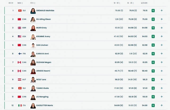 另两名中国选手韩林杉、刘梦婷均凭借第二滑的出色发挥晋级决赛。而另一位中国选手杨如意无缘晋级。