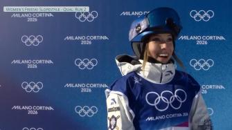 谷爱凌在首轮第二个出场,但她出现失误意外摔倒,随后坚持完成整套滑行,结束这一跳,得分1.26分。谷爱凌之后迅速调整,第二跳流畅完成获得75.3分的高分最终晋级。