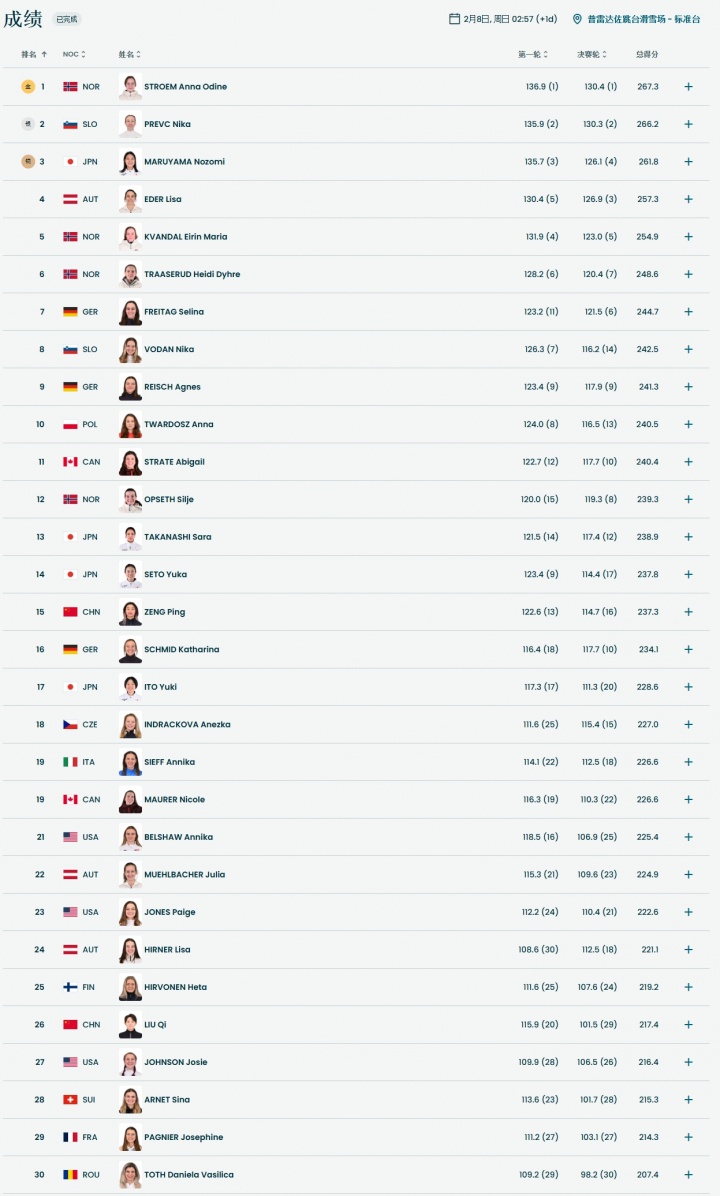 直播吧02月08日讯 跳台滑雪女子标准台决赛轮,中国小将曾坪顺利完成决赛轮跳跃,得分:114.7 总分:237.3。排名第15。