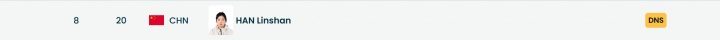 原定第8个出场的中国选手韩林杉未出赛。预赛中韩林杉得到62.98分,以第5的身份晋级决赛。