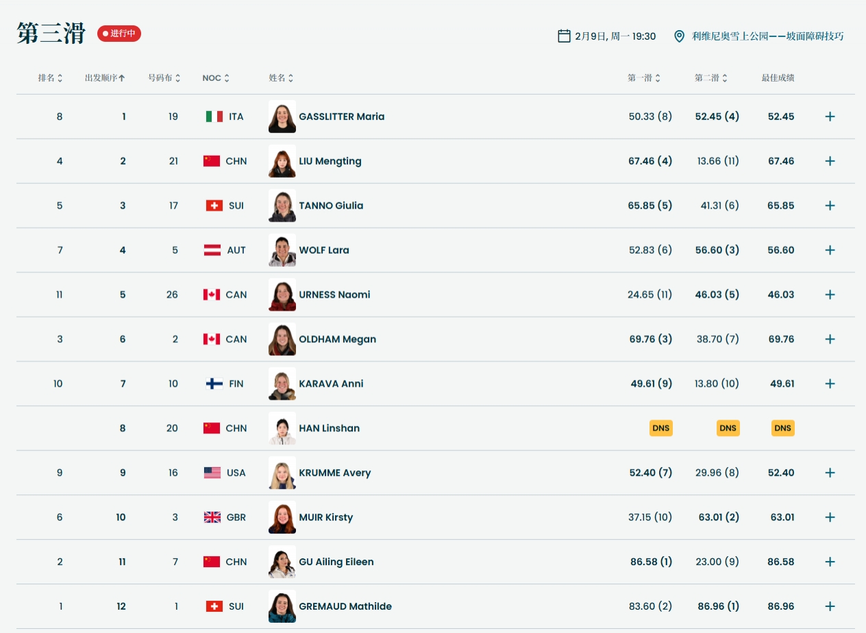 三位中国选手中,刘梦婷第2位出场,韩林杉第8位出场,谷爱凌第11位出场。该项目的卫冕冠军瑞士选手玛蒂尔德·格雷莫德最后一位出场。