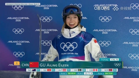 谷爱凌第一个出场,第一滑86.00分,第二滑失误摔倒20.75分,第三滑84.75分,总成绩170.75分,排名第二,晋级决赛。
