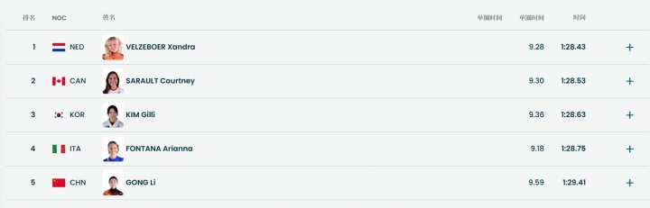 考特妮·萨罗1:28.523获得银牌,金吉莉1:28.614获得铜牌。