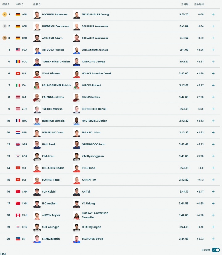 孙楷智/安泰的组合以3分44秒17完赛,最终排名第十六;李纯键/叶杰龙的组合以3分44秒59完赛,最终排名第十七。两队均刷新了中国代表团在该项目的最好成绩。
