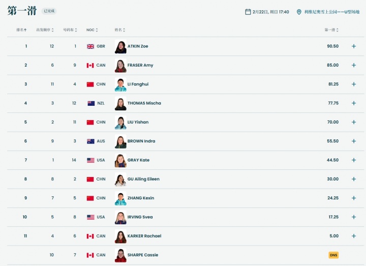 直播吧02月22日讯 米兰冬奥会自由式滑雪女子U型场地技巧决赛第1轮,中国选手李方慧、谷爱凌、张可欣、刘奕杉出战。