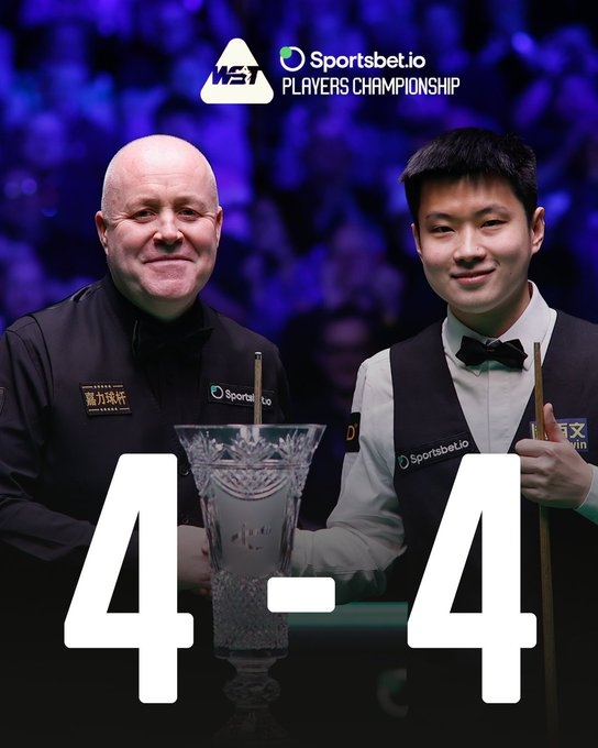 第七局赵心童冲击147,遗憾未能打进第11颗黑球,第八局希金斯单杆90制胜,两人4-4结束第一阶段。