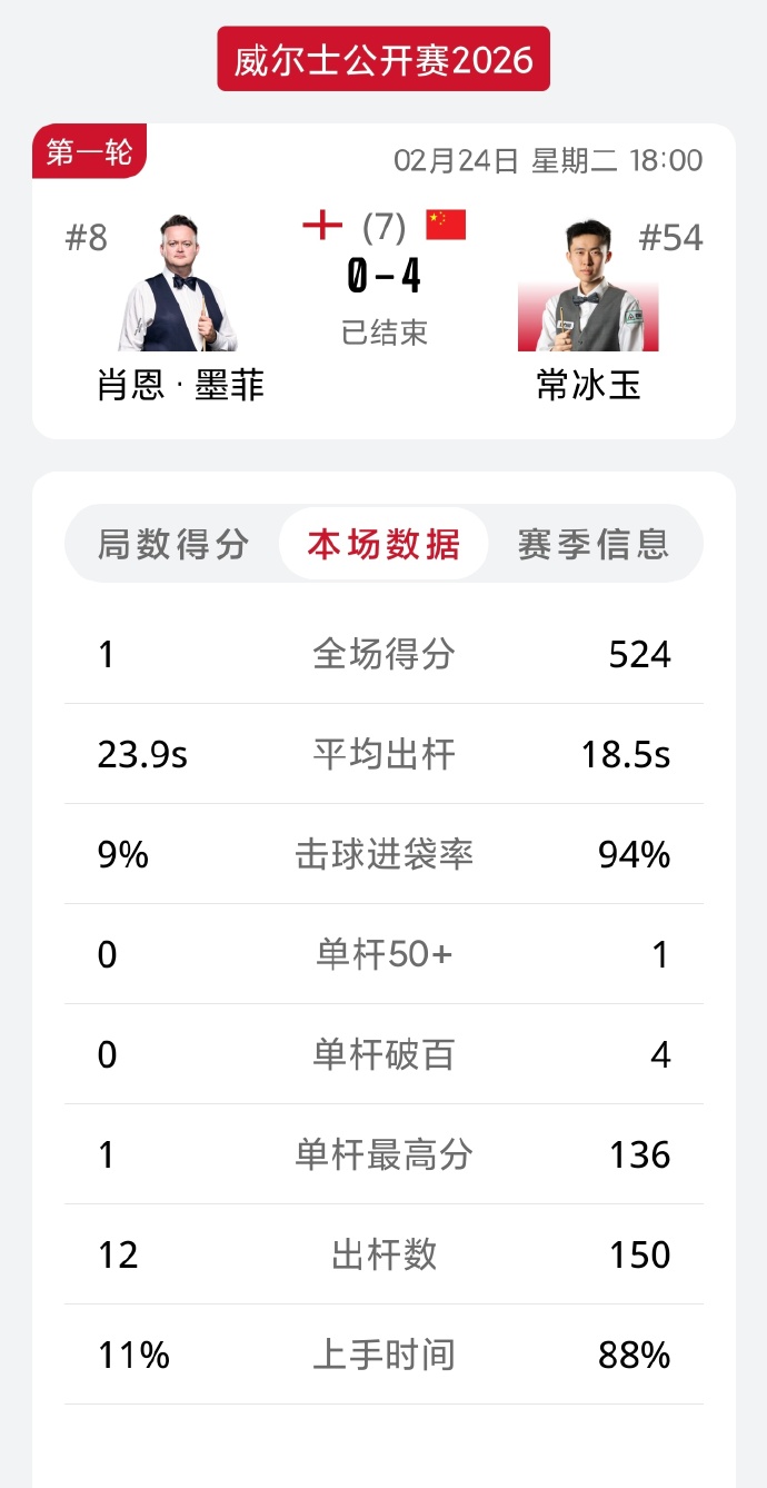 常冰玉打出四杆破百(130、136、119、130),以4-0的比分战胜肖恩·墨菲晋级32强,墨菲全场仅得1分。