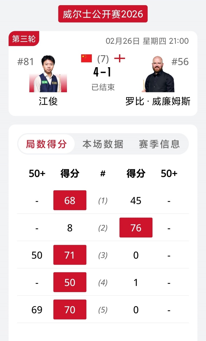 直播吧02月26日讯 2026斯诺克威尔士公开赛16进8轮次,中国选手江俊对阵英格兰选手罗比·威廉姆斯。经过5局较量,江俊4-1战胜罗比·威廉姆斯,晋级八强。