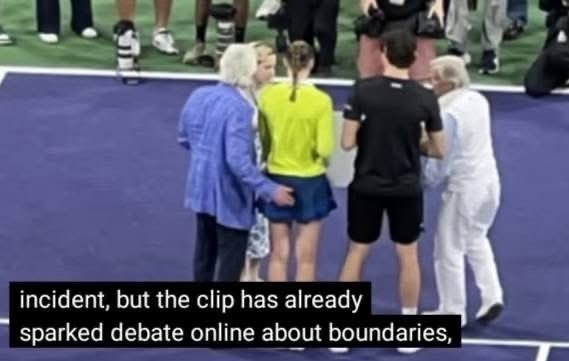 赛后,莱巴金娜和弗里茨获得20万美元奖金和奖杯,合影环节莱巴金娜疑似遭颁奖嘉宾咸猪手。这位颁奖嘉宾是艾森豪威尔健康基金会的高级副总裁大卫·伦克尔,他在合影时将手搭在莱巴金娜身后,随后被莱巴金娜伸手轻轻推开。