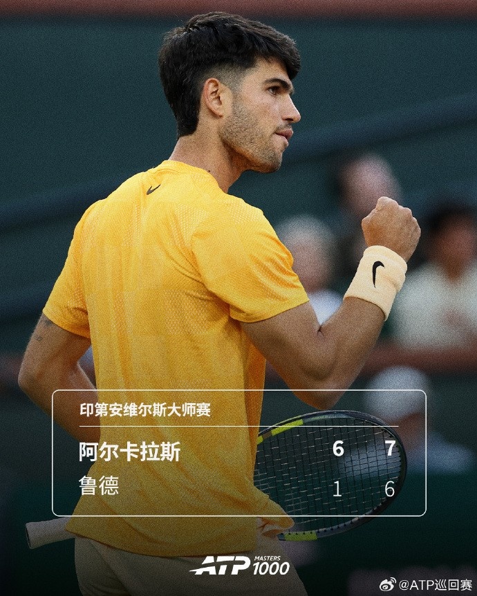 直播吧3月12日讯 ATP1000印第安维尔斯大师赛第四轮,两届赛会冠军、头号种子阿尔卡拉斯直落两盘击败鲁德,晋级八强。