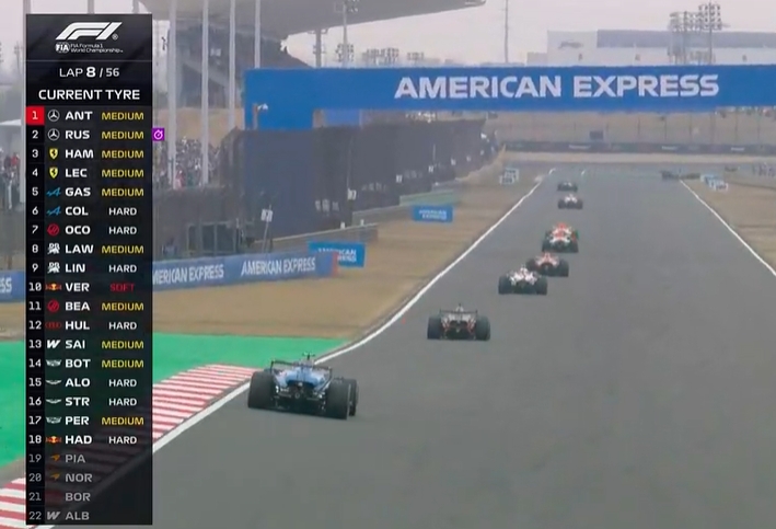 第3圈,拉塞尔超过勒克莱尔升至第三。随后第4圈拉塞尔再超越汉密尔顿升至第二。梅赛德斯和法拉利双车排在前四。