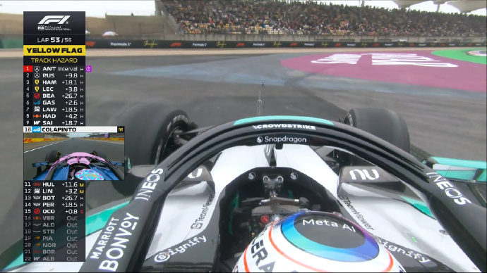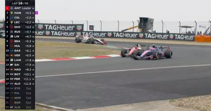 安全车回站后,第14圈汉密尔顿超越拉塞尔、奥康升至第3。之后在第15圈勒克莱尔也连续超越拉塞尔和奥康。拉塞尔告知车队抓地力不太好。