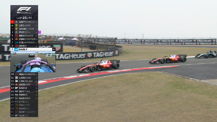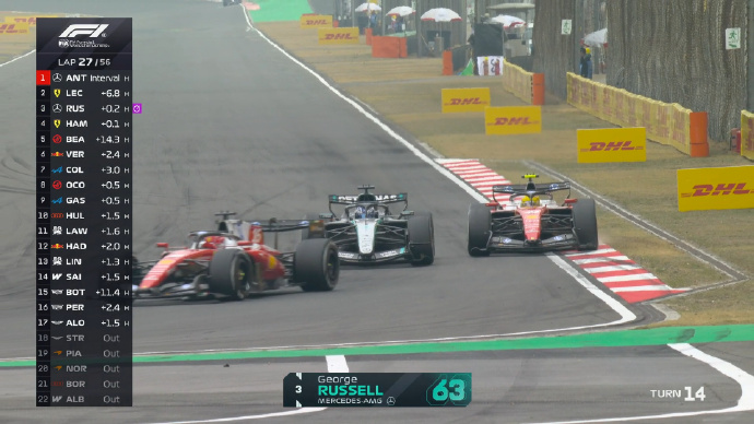 第24圈,法拉利车队内斗,勒克莱尔和汉密尔顿互相超越。拉塞尔试图超越汉密尔顿没能成功。