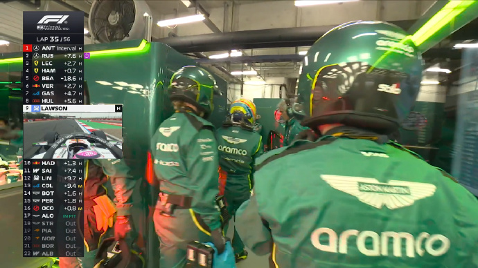 第10圈,劳森、维斯塔潘、塞恩斯进站。斯托尔的车停在赛道上随后退赛,安全车出动。