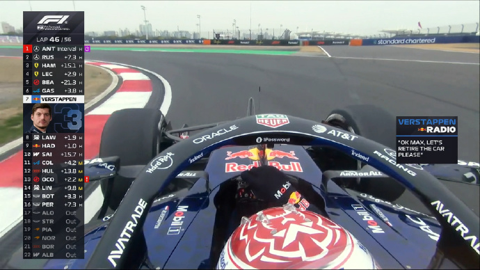 第44圈,霍肯伯格超越奥康来到第12位。第46圈,车队告知维斯塔潘退赛。