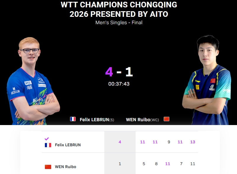 直播吧03月15日讯 WTT冠军赛重庆站男单决赛,世界排名第27位的19岁中国选手温瑞博,对阵世界排名第6的法国选手小勒布伦。最终温瑞博1-4不敌小勒布伦,获得本站亚军,而在女单决赛中蒯曼3-4不敌张本美和,国乒男女单均无缘冠军。