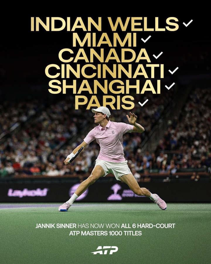 这也是他第六个大师赛冠军,实现了六站硬地大师赛全部夺冠的壮举,这还是辛纳的生涯第25冠!