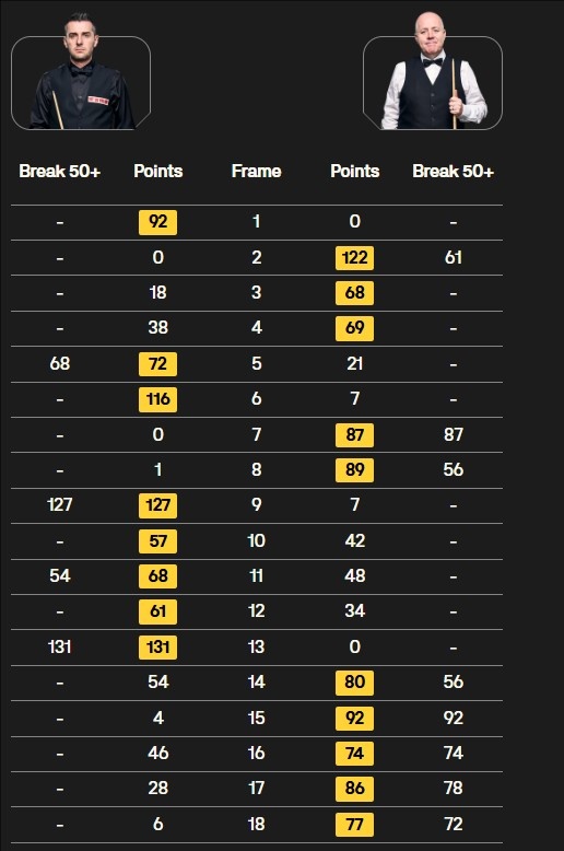 全场比赛马克·塞尔比打出两杆破百(127、131)和两杆50+(68、54),约翰·希金斯打出七杆50+(61、87、56、92、74、78、72)