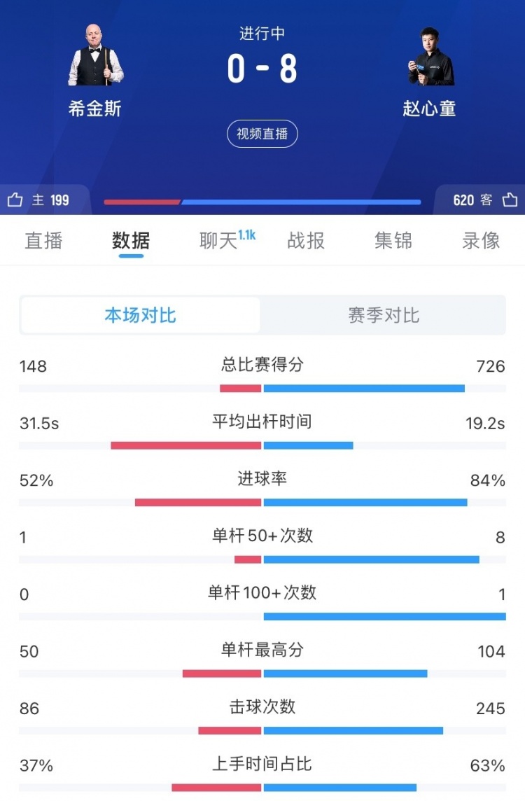 直播吧04月04日讯 世界斯诺克巡回锦标赛半决赛阶段1,赵心童8-0领先希金斯进入第二阶段。双方第一阶段数据如下