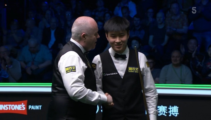 赛后转播给到,希金斯和赵心童握手,赵心童面露笑容。