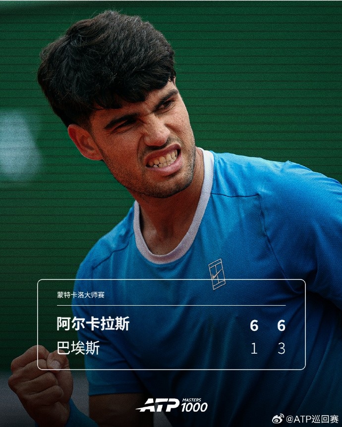 直播吧4月7日讯 ATP1000蒙特卡洛大师赛第二轮,阿尔卡拉斯直落两盘击败巴埃斯,晋级第三轮。