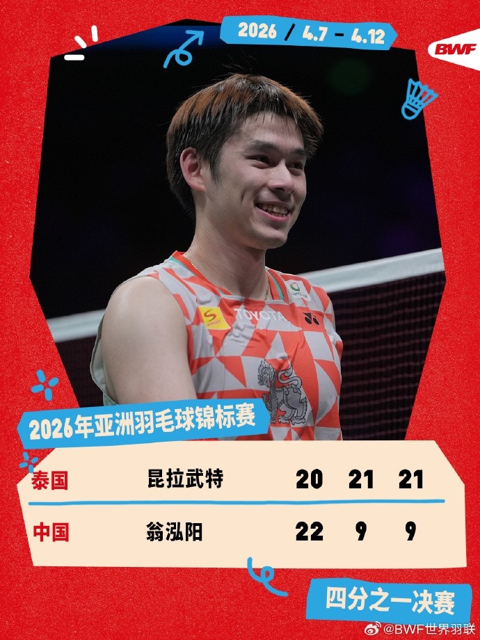 直播吧4月10日讯 羽毛球亚锦赛男单1/4决赛,中国选手翁泓阳1-2不敌卫冕冠军昆拉武特,止步男单八强。